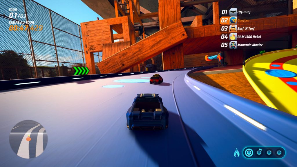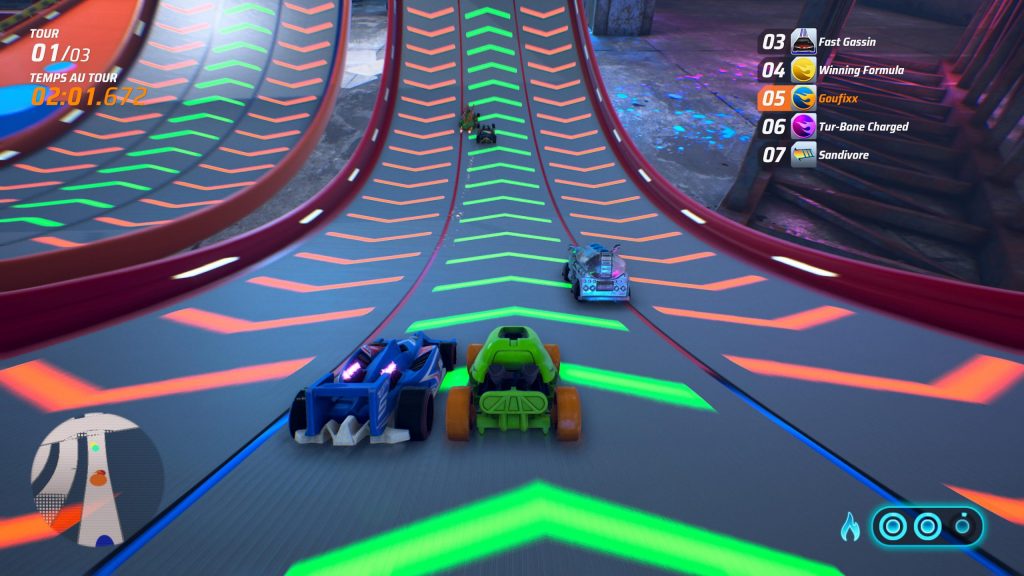 Lorsque nous regardions attentivement les diverses bandes-annonces du jeu ou encore les quelques phases de gameplay présentes sur YouTube, nous ne savions pas tellement à quoi nous attendre. En effet, si le jeu ne possède pas d’armes ou d’éléments surréalistes qui feraient de lui un Mario Kart-like, force est de constater qu’il était assez difficile de se faire un avis sur le pilotage du titre sans avoir la manette entre les mains. Mais rassurez-vous, une fois en piste les sensations sont très bonnes. Axé arcade, Hot Wheels Unleashed profite d’une maniabilité exemplaire et notre peur d’avoir affaire à un morceau de savon sur roues est levée. Les voitures accrochent bien la piste, la conduite est très agréable, le rythme soutenu et la prise en main est quasi-instantanée. Toutefois, sinon ça ne serait pas drôle, la difficulté des différents tracés combinée à l’obligation de maîtriser le drift apporte du piment nécessaire à l’intérêt du jeu. On retrouve donc une part de Trackmania avec cette obligation de maîtriser le circuit pour devancer nos concurrents avec toutefois un changement apportant : l’arrivée d’une jauge de boost.