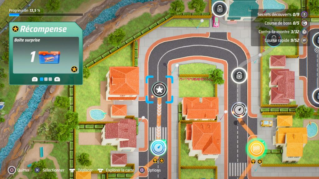 Pour un jeu de voiture, la présence d’un mode carrière est quasiment obligatoire pour proposer aux joueurs, ne désirant pas se plonger dans les modes online, un motif de parcourir le soft. Malheureusement, le mode Hot Wheels City Rumble ne restera pas dans les annales malgré quelques bonnes idées. Si les combats de boss ou les secrets à dénicher paraissaient intéressants sur le papier, on se retrouve avec à peu près 90 courses à effectuer pour venir à bout de ce mode et ce sans scénario ou trame principale. De plus, on retombe très rapidement sur les mêmes circuits et les variantes sont très peu diversifiées avec uniquement des courses rapides ou du contre-la-montre (ce sont par ailleurs les deux variantes jouables en solo hors mode Carrière). Un mode survie aurait pu être pertinent par exemple et aurait permis d’ajouter de la variété. En ce qui concerne le multijoueur, Hot Wheels Unleashed propose des parties rapides en ligne et c’est tout, malheureusement. Pas de parties classées, un manquement dommageable malgré la possibilité de jouer en cross-play (PS5 avec PS4 et Xbox Series avec Xbox One). Un mode split-screen est également disponible mais malheureusement limité à deux joueurs.