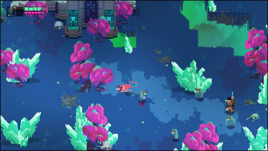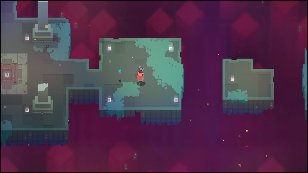 Prenant la forme d’un action-RPG, Hyper Light Drifter met en avant l’exploration dans toute sa splendeur. Les quatre zones (nord, sud, est et ouest) peuvent être considérées comme d’immenses donjons ouverts, dans lesquelles on commence par se perdre, pour se heurter à des portes closes et enfin y trouver nos repères. La map ne sera généralement pas d’une grande aide pour se localiser directement, mais permettra de mettre le doigt sur les clés à obtenir afin d’atteindre le boss et l’occire au court d’un combat épique. Mais foncer directement dans la gueule du loup, sans même prendre la peine de visiter les moindres recoins de chaque zone serait fort dommage. D’innombrables secrets, réserves de vie et gemmes dorées se cachent ici et là, rappelant le level design d’antan, où les feuillages d’un arbre pouvaient masquer un chemin dérobé, ou encore un passage invisible que le compagnon de voyage de Drifter se fera un plaisir de révéler.