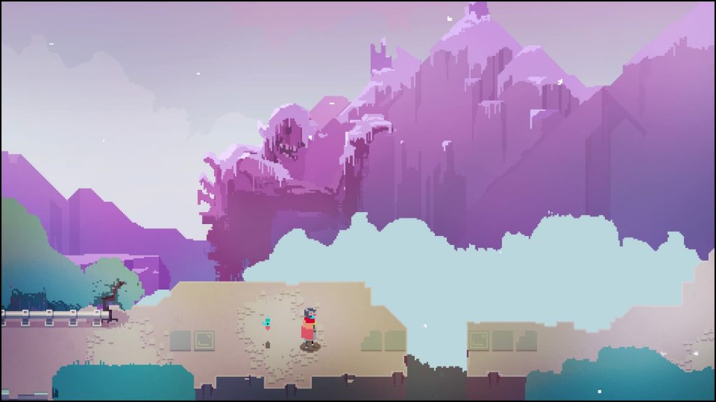 L’arrivée dans le monde de Drifter, notre protagoniste, se fera par le biais d’une courte cinématique qui posera les bases du scénario. Souffrant d’un mal inconnu, notre jeune héros se voit contraint d’aller explorer des ruines afin d’y trouver un remède. Mais sa quête n’aura rien d’une promenade de santé, aussi il devra faire face à un bestiaire aussi agressif que diversifié, le tout dans des environnements hostiles malgré leur pureté presque immaculée. Mêlant ambiance futuriste et couleurs pastel épurées, la direction artistique de haute volée offre tout au long de l’aventure de très jolis panoramas qui nous donneraient presque envie de poser la manette pour les contempler.
