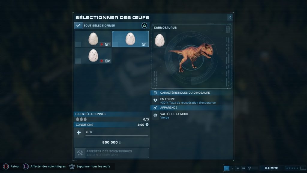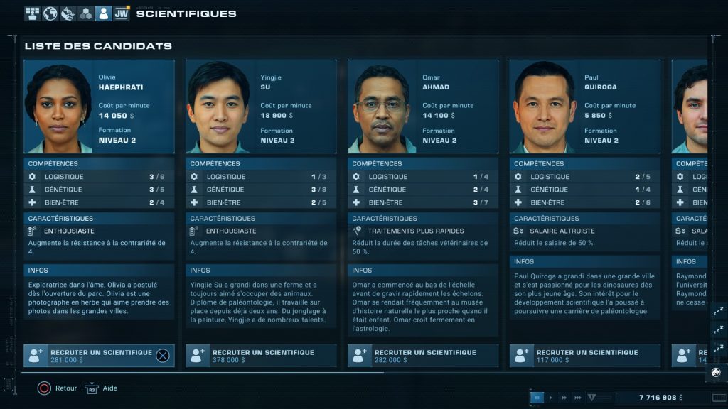 Si Jurassic World Evolution 2 apporte quelques bonnes idées, il en complexifie d’autres inutilement, à l’image des dépenses en matières énergétiques et en essence. Effectivement, il faudra de manière régulière attribuer de l’argent dans ces ressources sous peine de voir vos infrastructures sous-alimentées et vos équipes d’interventions clouées au sol. Si la chose venait à se produire et que vos dépenses sont au rouge, vous pouvez vous attendre au Game Over sous peu. Fort heureusement, vous pourrez investir dans les bonnes vieilles centrales électriques à un moment donné, ce qui allège un peu la chose. Une bonne idée sur le papier, le management du staff scientifique nous laisse en demi-teinte. L’idée de recruter, former et employer vos scientifiques à la création de vos dinosaures est intéressant en soi mais malheureusement, le système s’avère peut-être un poil trop poussif. On fera appel à eux pour tout et n’importe quoi allant de la fouille de fossiles à l’incubation de vos dinosaures comme cité plus haut. On vous demandera aussi, désormais, de choisir le comportement de vos animaux au premier tiers de la création, les scientifiques étant toujours sollicités. Recrutables depuis le centre de contrôle, vous pourrez passer en revu les compétences diverses des candidats avant de les embaucher. Chaque scientifique possède un certain nombre de points de compétences dans les domaines de la Logistique, Génétique et du Bien-Être, ainsi que des caractéristiques et son coût sur vos finances par minute. Utiliser vos scientifiques pour des tâches entamera sa barre de productivité au fur et à mesure. Arrivé à ses limites, un scientifique aura besoin de vacances sous peine de se mettre en colère et d’être de moins en moins performant. Il faudra donc penser à créer un poste de gestion de ressources humaines afin de congédier vos employés. Chaque scientifique ayant son propre niveau de départ, il sera aussi possible de les former pour leurs octroyer quelques points de compétences supplémentaires.