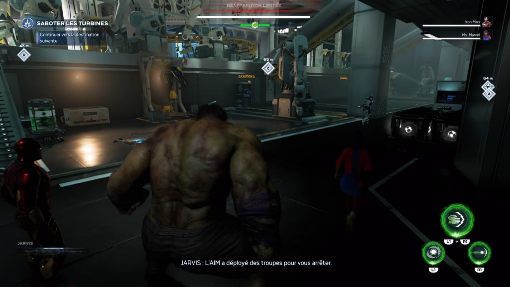 Encore une fois, il sera difficile de ne pas comparer Marvel’s Avengers au ténor : Destiny. Certes les gameplay proposés sont intrinsèquement opposés, cependant il est intéressant de souligner pourquoi pour le bébé de Bungie cela s’avère beaucoup plus plaisant alors que pour celui de Crystal Dynamics… beaucoup moins. Ce qui fait le sel de Destiny c’est sa nervosité et sa tacticité. Les combats s’exécutant en majorité à l’arme à feu, le jeu vous oblige à être en mouvement perpétuel face à l’afflux d’ennemis. Même si vous jouez au fusil sniper, camper une position est pratiquement impossible. Il faudra toujours bouger à un moment donné pour éviter un ennemi venant au corps-à-corps ou bien un projectile. Dans Marvel’s Avengers, le parti pris est d’être un bête et méchant beat’em up. Du coup, le but n’est autre que de foncer dans le tas et de pratiquer le « spam de touches ». Il existe bien une touche pour esquiver les coups, mais pour automatiquement retourner à sa routine. Les combats en deviennent vite brouillons quand les salles sont un peu trop chargées en ennemis, et quand quatre joyeux lurons s’en donnent à cœur joie, ça en devient encore pire – sans oublier le framerate qui en prend un sacré coup au passage. Après avoir enchaîné un certain nombre de mandales dans la caboche d’un adversaire, il est possible d’effectuer une exécution en pressant Triangle et Rond en même temps. Plusieurs chorégraphies sont à débloquer, cependant il ne semble pas possible de pratiquer une exécution en duo cependant, dommage.