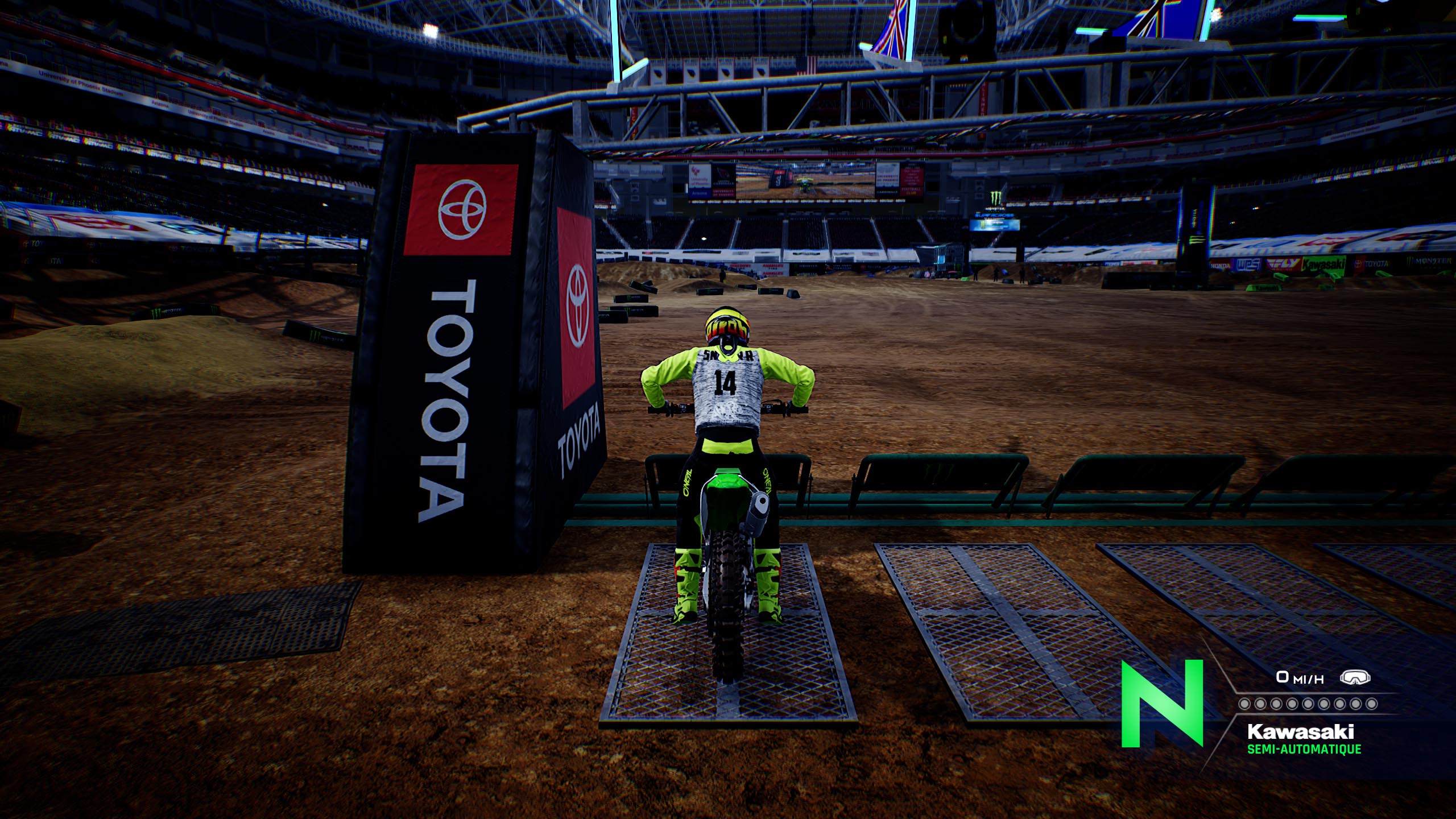 Lorsque l’on se lance dans le test d’un jeu comme Monster Energy Supercross 4, on espère en tirer de réelles sensations, en extirper la portée organique et grisante que peuvent avoir les bonnes simulations de sports mécaniques. Oscillant entre l’arcade et la volonté de réalisme en optant pour de vrais circuits, de vrais stades, de vrais dômes, de vrais riders, de vrais sponsors et de vrais championnats, le jeu tente de trouver un périlleux équilibre pour convenir à la fois aux aficionados du genre mais aussi aux novices qui souhaiteraient s’essayer le temps de quelques heures à la supercross virtuelle. Puis, arrive la crainte principale qu’il est particulièrement difficile de réprimer : d’ans un jeu où les sponsors semblent avoir une telle place, une telle importance, quel est le dessein final ? Nous vendre un vrai jeu de supercross travaillé et préparé avec amour pour le joueur avide de sports motorisés ou nous vendre une vitrine, une publicité luxueuse pour des boissons énergisantes ? Enfourchez votre plus belle Kawasaki, découvrons plus en détails le dernier jeu développé et édité par Milestone, et en route pour les circuits les plus accidentés du championnat américain !
