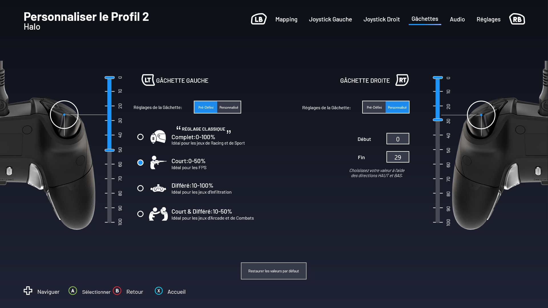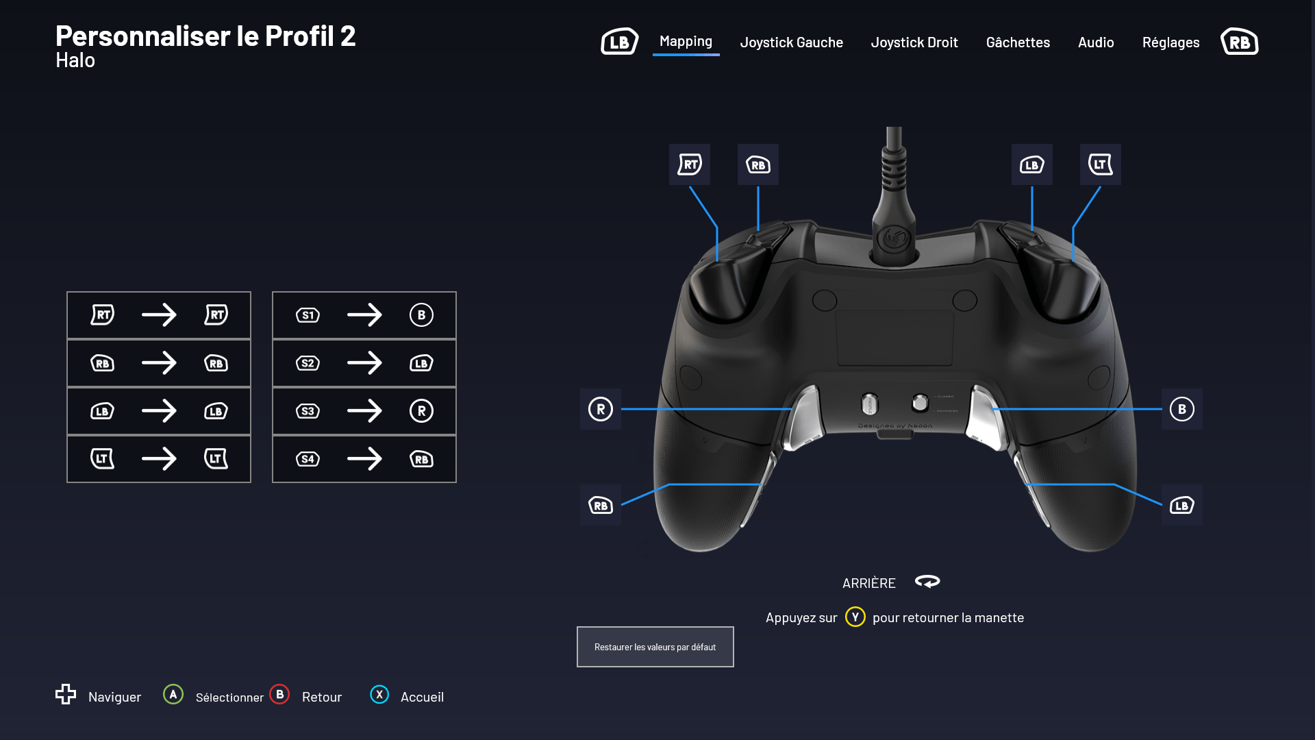 Si sa prise en main ressemble grandement à celui d’une manette Xbox classique malgré ses propositions additionnelles telles que la course des joysticks ajustables et les poids interchangeables, la force de la manette Revolution X Pro réside surtout dans sa personnalisation logiciel. En effet, bien que la manette intègre un profil dit « classique » et par conséquent non modifiable permettant de se lancer dans un jeu sans se soucier des personnalisations possibles, elle intègre aussi 4 profils assignables et configurables. Avec eux, personnalisez les touches, la course de réponse des joysticks et des gâchettes, l’audio ainsi que la couleur des leds situés en dessous du joystick. Soupçon de RGB qui apporte un peu de « m’as-tu-vu ? » à la manette et qui permet aussi d’identifier visuellement et facilement le profil sélectionné.
