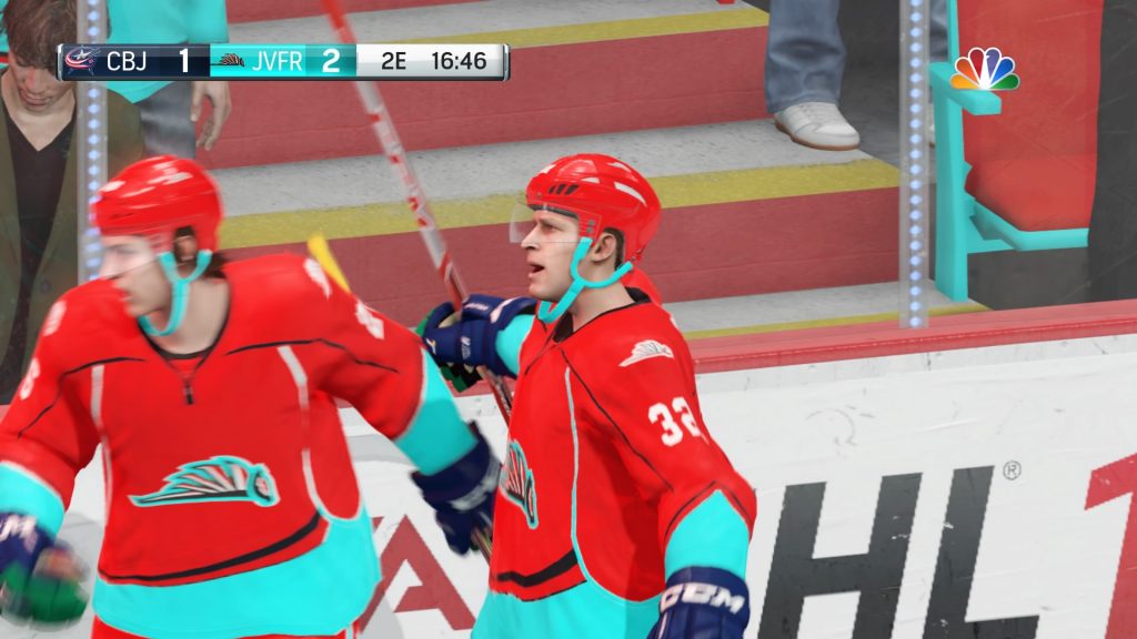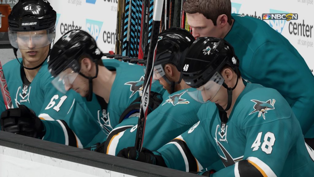 Le mode Deviens Pro permet de créer son joueur avec un outil plutôt complet, offrant même la possibilité de customiser son chandail, sa crosse, ses patins et même son casque. Le but étant de gérer la carrière d’un joueur pour le mener vers les sommets et devenir une légende de la NHL. On commence en tant que rookie en ligue inférieur, on se fait ensuite drafter et recruter par une grosse écurie de la Ligue National de Hockey. On gère ses entraînements, et on peut aussi avoir un aperçu de son évolution via diverses statistiques, mais cela reste un peu trop facile. Après seulement trois bons matchs, nous avons intégré directement la ligne d’attaque une de l’équipe sans jamais la quitter par la suite. Cela manque légèrement de profondeur et même si, comme dans NHL 16, notre façon de jouer détermine le type de joueurs que nous devenons au fur et à mesure des parties, on reste sur notre faim. Comme dans tous les autres modes de jeux, un entraîneur sur glace, paramétrable, est aussi présent pour nous donner des conseils et attend de nous que l’on remplisse certains objectifs en match, comme resserrer notre défense ou exécuter certains gestes techniques. Ceci nous apporte de l’expérience nous servant à augmenter de niveau dans des domaines bien précis et on peut même parfois subir des pertes d’XP losque l’on nous ne brille pas en match. Ce système est franchement une bonne idée et chaque action, bonne ou mauvaise, que l’on réalise sur le terrain à une incidence directe sur l’évolution de notre joueur, un tableau récapitulatif est d’ailleurs présent pour nous rappeler nos erreurs et nos réussites. Reste que face à la concurrence d’autres jeux de sports, ce mode Pro fait pâle figure et n’est pas assez complet, même si quelques idées font mouche.
