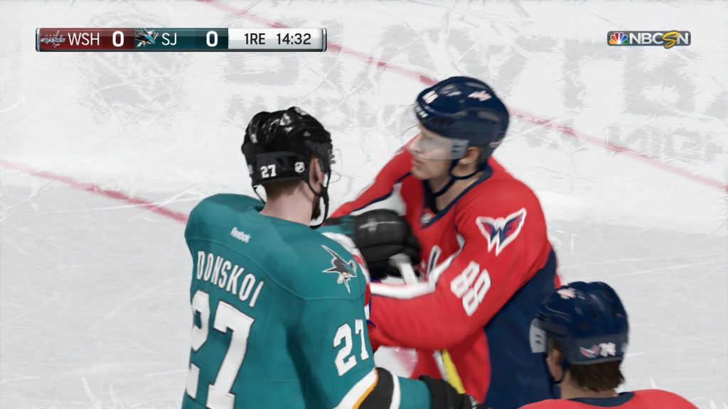Les sensations sont bonnes, voire grisantes parfois, on a l’impression de patiner avec nos avatars sur cette glace par définition glissante et on vit les matchs avec la même pression que lorsque notre équipe favorite est en difficulté sur notre écran de télévision. On aimerait même participer aux bagarres qui ont parfois lieu, lorsque par exemple on tire au but alors qu’on est déclaré hors jeu et qu’un élément de l’équipe adverse veut nous puncher sans vergogne. On aimerait, car franchement ces phases sont ratées et l’étaient déjà dans l’opus précédent. C’est mou, brouillon et on en vient à regretter les bonnes bastons des années 32-128 bits. Une imprécision de gameplay énerve aussi assez souvent manette en mains, lorsque l’on veut changer de joueur en défense, il s’avère que le jeu nous en refourgue un bien souvent éloigné de l’action, ce qui peut vite devenir un handicap. Cela ralentit totalement la mise en place de notre mur défensif et le phénomène se répète si souvent que ça en devient un véritable défaut et une grosse erreur de programmation. Autre chose, il y a parfois des bugs d’animation sur certaines actions, presque sans incidence sur le cours du jeu ou d’un match, puisqu’elles interviennent la plupart du temps lors d’arrêts de jeu. Il nous est arrivé de voir des joueurs tourner sur eux-mêmes sans raison ou encore ne pas réussir à rejoindre le banc pour un changement, restant alors bloqués devant les gradins. Des petits détails amusants diront nous, mais après tout c’est inhérent à l’Ignite Engine qui fait tout de même un très beau boulot sur ce NHL 17.