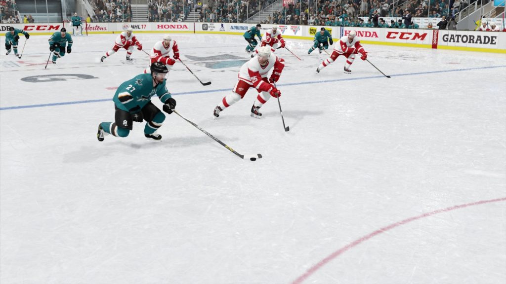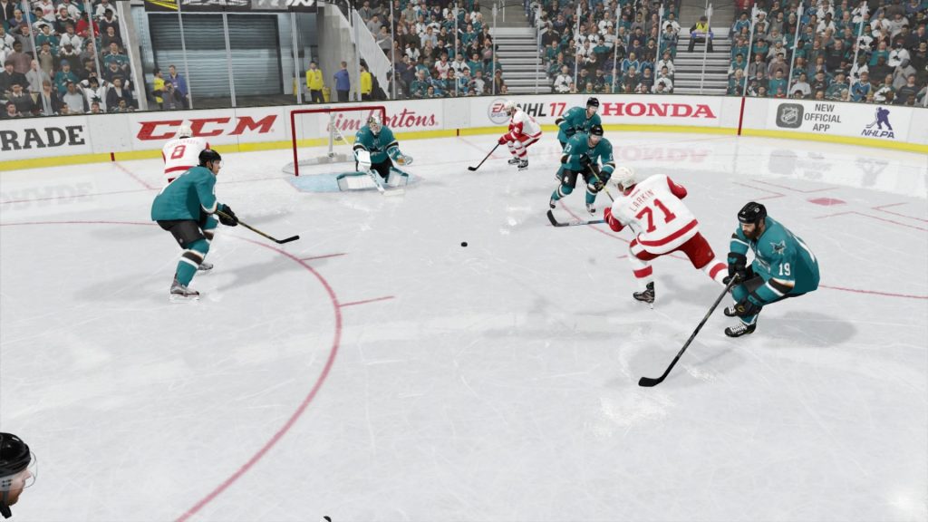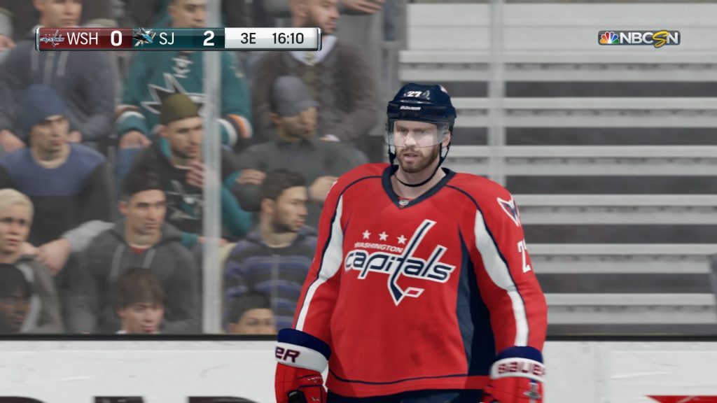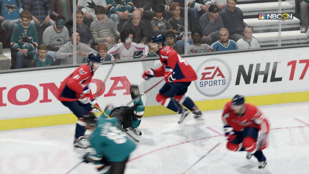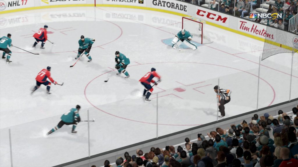 NHL 17 est une très belle simulation sportive, sans être à tomber par terre. La modélisation des différents stades est une réussite, le public en 3D l’est tout autant et est très détaillé, arborant les couleurs, les écharpes, les chandails des équipes qu’il supporte. Les arbitres, les commentateurs télé, les mascottes, les stadiers, tout y est et pour un peu on se croirait vraiment au stade à scander des « Go Red Wings » une bière dans une main et un sachet de pop corn dans l’autre. La glace est belle et les traces laissées par les lames des patins sont bluffantes. Le petit bémol vient comme auparavant des joueurs, car si bien animé et modélisé, on regrette que certains faciès s’écartent trop de leurs homologues réels et il en va de même pour les expressions faciales trop effacées. Mis à part cela, les détails sur les chandails, les crosses, les patins ou encore les casques sont là encore à la hauteur des attentes que l’on peut avoir sur un jeu de cette génération. Les effets de lumières sur la glace sont très bien rendus et changent en fonction des stades. C’est presque un sans-faute et seules des fautes techniques viennent noircir le tableau, car outres les quelques petites choses énumérées dans le paragraphe précédent, il arrive que des joueurs s’emboîtent lors des célébrations et même en jeu, alors que les collisions sont de très bonnes factures rappelons-le. Toutes ces petites choses cassent quelque peu l’immersion, car très présentes finalement. De même lorsque l’on attend son entrée en jeu sur le banc, il arrive souvent que nos coéquipiers restent de marbre face au match et soient aussi expressifs qu’un chien qui dort. La plupart du temps ils ne suivent même pas l’action des yeux et exultent comme par miracle si un but est marqué. Alors oui c’est beau, mais quelques ajustements techniques restent encore à faire pour atteindre une qualité optimale.