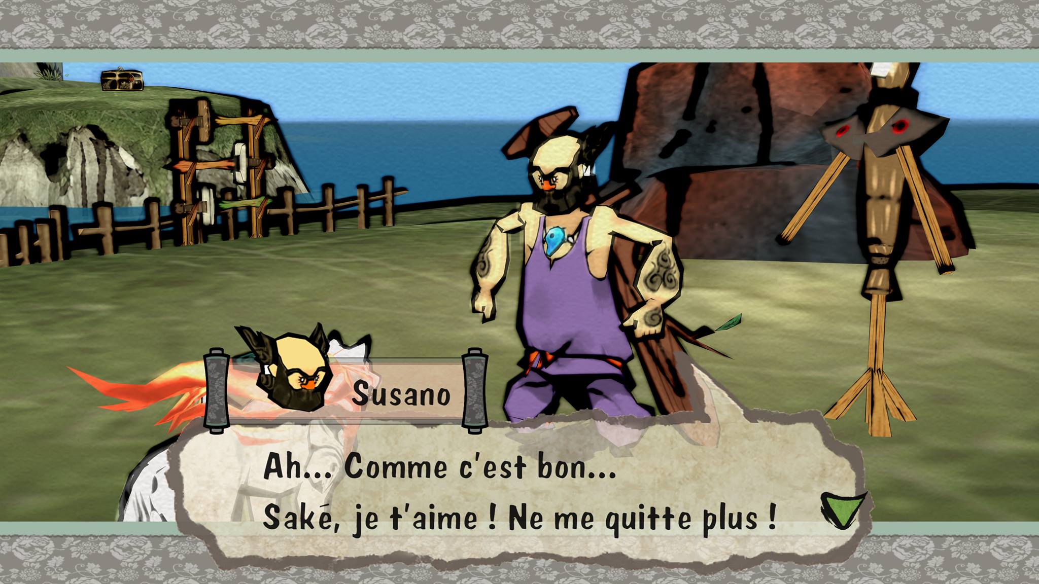 Deuxième ajout à noter sur toutes les versions : le choix du ratio. En effet, pour ceux qui voudraient retrouver l’ambiance de la version PS2, Okami HD vous laisse le choix via le menu Options de basculer en 16:9 ou en 4:3. Évidemment, cela n’a que très peu d’intérêt en soi, sauf si vous aimez les bandes noires. Sachez également que Capcom s’est décidé à remettre un bonus qui avait été retiré de la première version HD du jeu, à savoir les mini-jeux qui apparaissent durant les temps de chargement. Ces derniers vous permettent de remporter des Crocs de Démon, monnaie qui vous sera demandée si vous avez l’intention de vous procurer des objets en jeu. Enfin, ultime ajout, réservé cette fois à la version PS4 : le Pinceau Céleste (qui vous permet de dessiner des formes qui prendront vie à l’écran) peut à présent être utilisé grâce au pavé tactile de la manette DualShock 4. Bien évidemment, vous pouvez tout à fait utiliser cette fonctionnalité en utilisant les touches du pad (à savoir R1 + Carré), mais disons que l’ajout est appréciable. Concernant le framerate, toutefois, certains seront probablement déçus d’apprendre que le jeu tourne cette fois-ci encore à 30fps, tandis que les menus, eux, atteignent les 60fps. Il faut malgré tout comprendre que le jeu n’a jamais été pensé pour être joué autrement qu’en 30 images/seconde, et que le rendu « tremblotant » façon estampe s’en retrouverait complètement faussé.