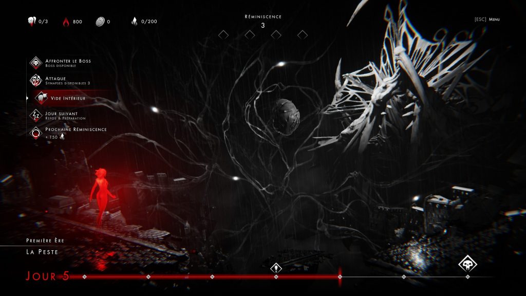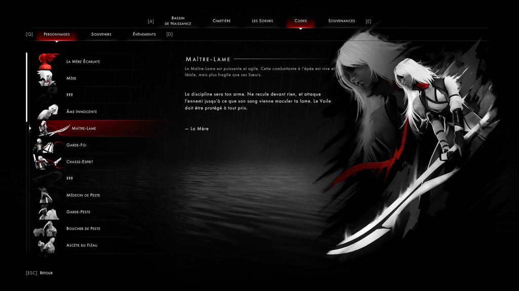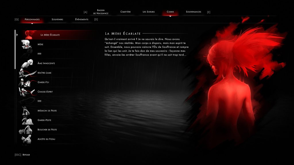 Dans une France éthérée, les sœurs sont le dernier rempart contre des créatures cauchemardesques nommées Souffrances. Générées par la Mère Ecarlate, les sœurs sont des guerrières pouvant rivaliser avec les terribles monstres qui tentent de plonger notre réalité dans le chaos. Ça c’est pour le speech de départ. Malheureusement, Othercide ne brille pas pour son storytelling. Si le lore n’est pas inintéressant en soit, le déroulement est trop décousu pour vraiment capter notre attention, la faute à un système de Souvenirs qui sont en réalité des brides d’informations que le joueur débloquera au fur et à mesure de sa progression, et dans un ordre non-chronologique. Il faut vraiment aller au bout de l’aventure pour comprendre les tenants et les aboutissants du monde d’Othercide, pour quelque chose qui tient plus du prétexte que de la révolution narrative ultime.