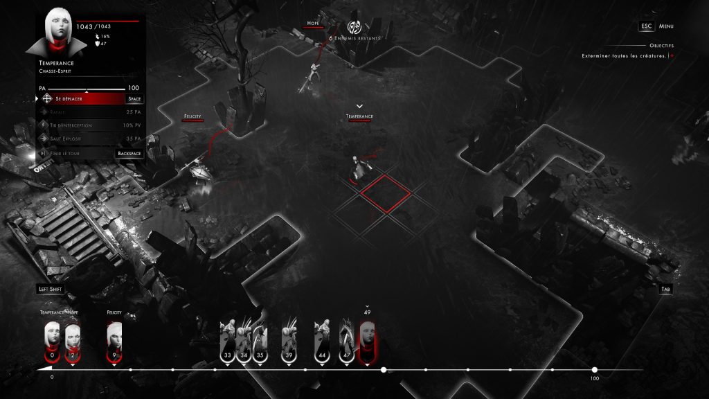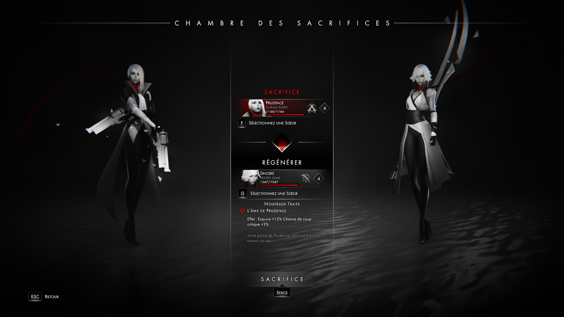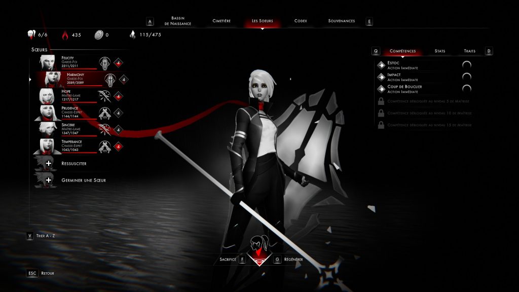 La mort et le sacrifice sont une part fondamentale d’Othercide. Si nous mentionnions plus haut que passer au jour suivant permettait aux sœurs de se reposer, leurs points de vie ne se verront pas restaurés pour autant pour peu que vous ayez subi des dégâts lors de votre précédent combat. Que faire dans ce cas-là ? Si vous souhaitez renflouer la barre de santé d’une sœur, il faudra forcément en sacrifier une autre de niveau équivalent ou supérieur. Terrible, n’est-ce pas ? Ne vous attachez donc pas à vos guerrières car ces dernières font clairement office de chair à canon et sont parfaitement remplaçables, « comme un outil qu’on jette après usage » pour paraphraser Dillon dans Predator. Une fois une sœur sacrifiée, elle continue à vivre à l’intérieur de sa congénère. Effectivement, la présence de l’âme d’une sœur dans une autre est indiqué dans ses Traits, vous apportant un buff plus ou moins important en rapport avec son niveau au moment de son sacrifice. Une sœur est-elle perdue pour toujours ? Pas totalement. Les missions de sauvetage, en cas de réussite, permettent de générer une nouvelle sœur à titre gratuit sans dépenser des points, ou bien d’être sacrifiée pour rappeler une guerrière tombée au combat. La sœur sera donc rappelée dans vos rangs et ce en conservant ses statistiques au moment de sa mort.