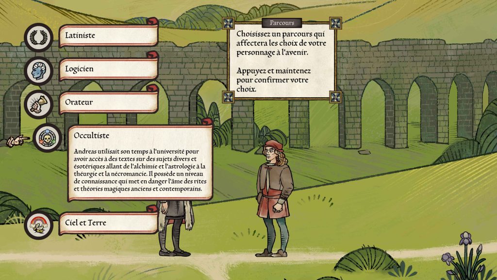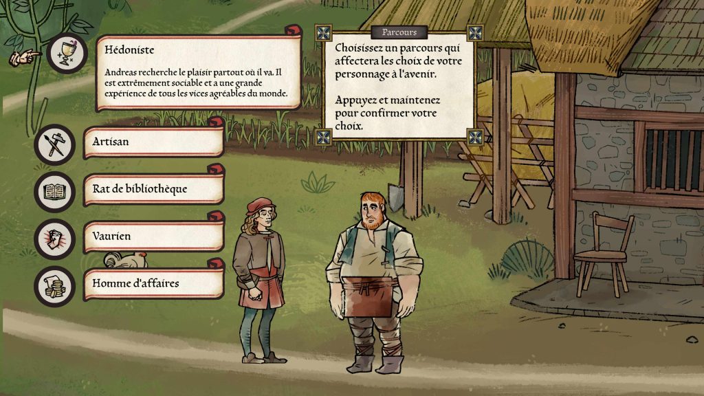 Toujours dans cette optique de choix à conséquences, le joueur est amené dès le début de l’histoire à définir le parcours d’Andreas. Ses origines, ses études et ses centres d’intérêts dicteront certaines lignes de dialogues uniques, qui permettront d’influencer certaines prises de décisions, de comprendre certaines langues ou bien de décoder les mailles du droit de l’époque. Autant d’éléments qui permettront une certaine rejouabilité, puisqu’in fine, le jeu ne dévoile pas le nom des coupables des différentes enquêtes que l’on mène tout au long de l’aventure, qui s’étale sur 25 ans. Ainsi, les coupables désignés seront uniquement du fait du joueur. De quoi s’impliquer totalement dans Pentiment.