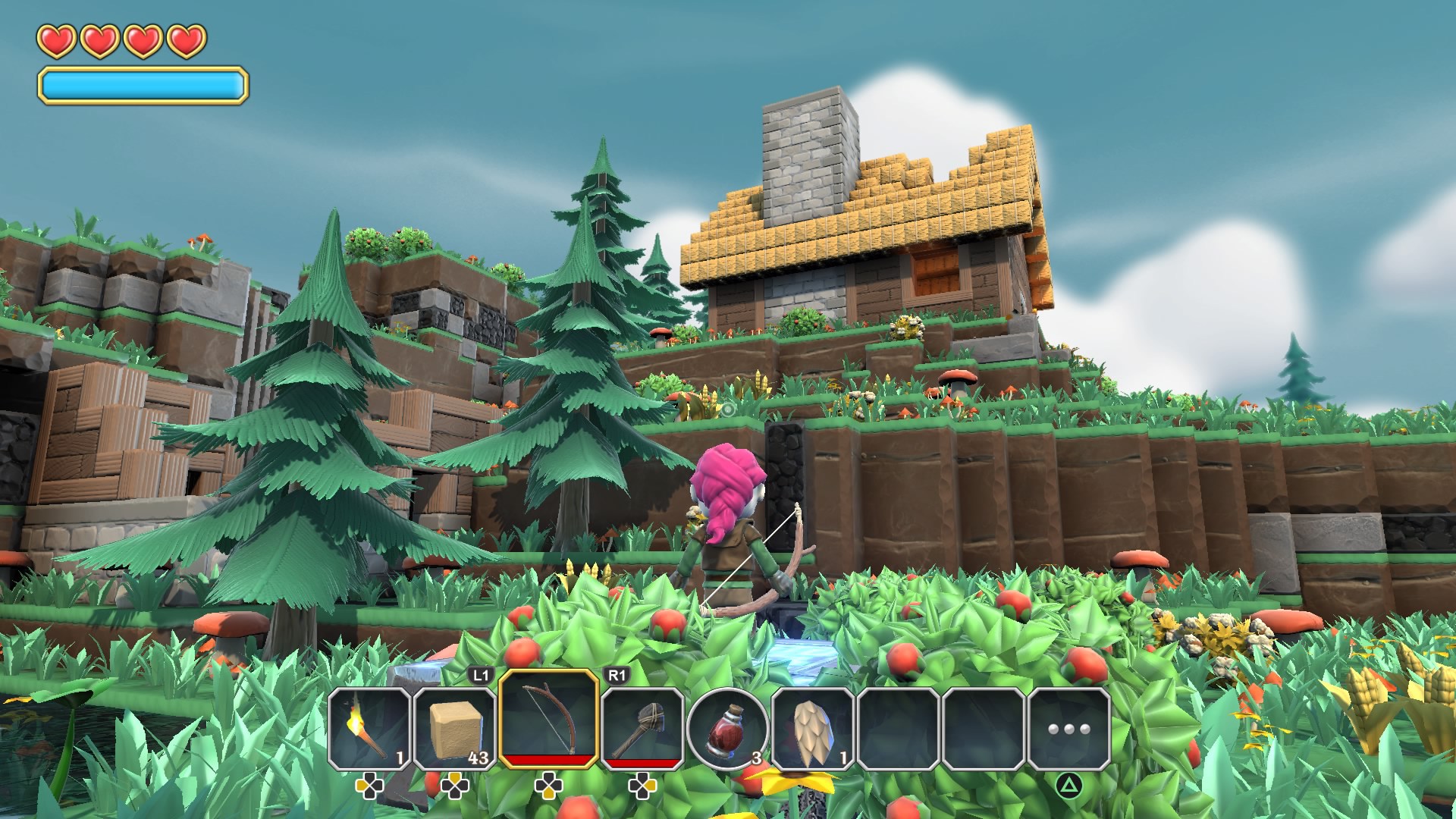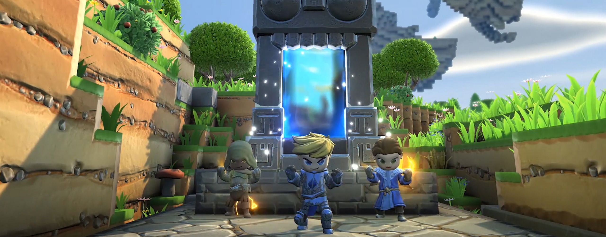 Sur ce point très précis (récolte/crafting), on pourrait véritablement se croire dans Minecraft. Car autant le dire de suite, Portal Knights a énormément de points de convergence avec le titre de l’écurie Microsoft. A commencer par la construction des éléments qui composent chaque carte, des sortes de cubes qu’il vous est possible de collecter puis de façonner à votre guise. Commencez avec un simple morceau de bois et une pierre tranchante, et faites-en une pioche capable d’extraire des minerais rares. De ces récoltes, confectionnez un nouvel établi, plus perfectionné que celui conçu précédemment. Celui-ci vous permettra de mieux vous armer, en créant de nouveaux équipements (baguette, épée, corset, cape, bottes…).
