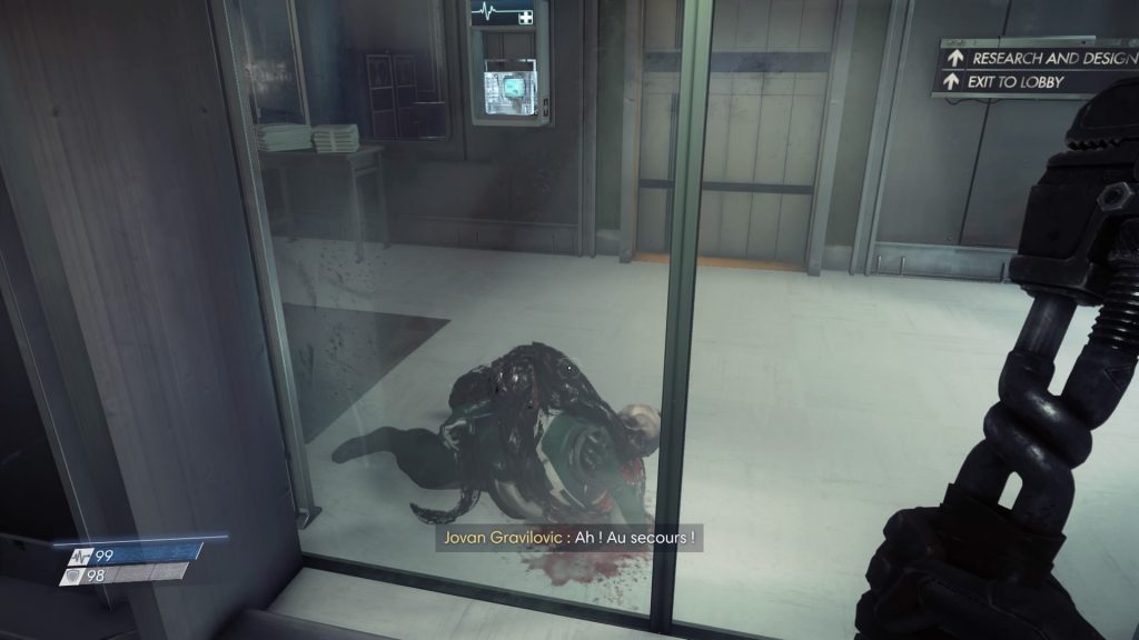 Dans Prey, la narration se fait aussi par ce qui nous entoure. De nombreuses notes, enregistrements audio ou mails sont dissimulés un peu partout et peuvent contenir des informations non négligeables, comme un code pour ouvrir un coffre-fort. Rien n’est laissé au hasard et cette narration passive participe pleinement à imposer une atmosphère oppressante, lugubre et même parfois effrayante. Les jeux de lumière, les cadavres et les aliens qui sortent de nulle part font planer une menace constante qui nous pousse à rester sur nos gardes. Le tout est magnifié par une superbe bande son qui, aussi bien dans ses musiques qu’avec ses bruitages, parvient à donner vie à la station Talos I. Il est vivement conseillé de jouer avec un casque pour pleinement apprécier le travail des développeurs et du compositeur Mick Gordon, qui avait déjà oeuvré l’année dernière sur la bande originale de DOOM. La réussite est bien au rendez-vous mais l’aspect technique n’est hélas pas exempt d’imperfections. Les textures paraissent souvent assez datées même si certains environnements sont très agréables à admirer. Mention spéciale pour les phases à l’extérieur de la station qui, si elles s’avèrent bien frustrantes en termes de maniabilité, parviennent tout de même parfaitement à nous plonger dans l’infinité de notre univers. Elles apportent aussi un peu plus de variété au gameplay. On regrettera aussi de très longs temps de chargement entre les zones qui cassent le rythme de l’aventure.
