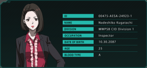 - Le premier est Nadeshiko Kugatachi, une inspectrice amnésique rejoignant la Division 1 du Département des Investigations Criminelles, chargée d’arrêter les personnes dont le PSYCHO-PASS est trop élevé, et, si besoin, de les éliminer.