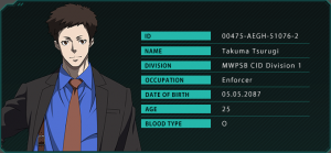 - Le second est Takuma Tsurugi, un homme recherchant sa compagne disparue et également membre de la Division 1 du Département des Investigations Criminelles. Son PSYCHO-PASS étant élevé, il agit en tant qu’« exécuteur », homme de main au service des inspecteurs et dont les actions sont étroitement surveillées.