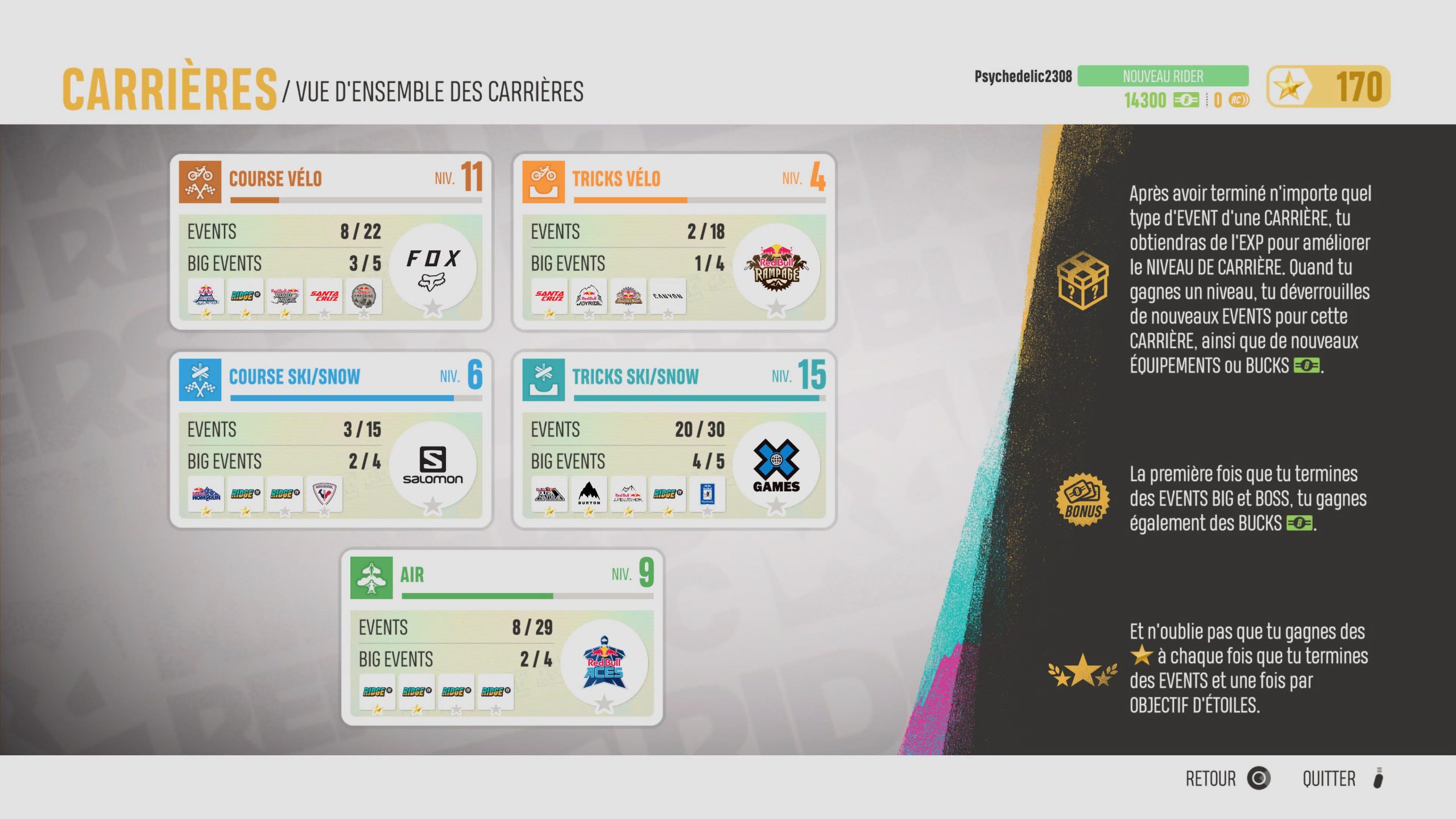 Néanmoins, le tout sert à un but bien précis : dans Riders Republic, les joueurs incarnent un jeune rider, qu’ils personnalisent selon leurs choix et goûts, devant faire ses preuves devant la Republic et le monde entier. L’objectif ultime étant d’atteindre le Ridge Invitational. Il s’agit du mode Carrière. Celui-ci est régulé par des niveaux, faisant office de grades. Comme pour signifier votre niveau de maîtrise du sport en question. À chaque niveau passé, les joueurs débloquent de nouveaux équipements (boards, vélos, suits, etc.) plus performants que les précédents ainsi que de nouvelles épreuves. Dans l’onglet concernant notre rider, dans le menu principal, on se rend alors vite compte que le contenu du jeu est assez vaste : par exemple, pour le snowboard/ski tricks, on compte pas moins de 30 défis avec 5 big events (compétitions). Oui, parce que c’est bien drôle de réaliser les défis de la Republic, mais c’est encore mieux de se lancer dans des épreuves un peu plus coriaces et compétitives, telles que les big events. D’ailleurs, pour vous donner un exemple, en ce qui concerne le snowboard/ski tricks, nous avons le droit à une compétition des X-Games comme épreuve finale. Celle-ci, en l’occurrence, nous a semblé un peu courte alors qu’elle devait être le bouquet final de notre carrière dans cette discipline. De manière générale, on aurait apprécié avoir accès à encore plus de compétitions/big events. Ajoutons tout de même à cela tous les autres sports proposés, dont le nombre d’épreuves est pratiquement égal à celui mentionné plus haut (image ci-dessous) et on se rend ainsi compte que Riders Republic n’est pas en avare en contenu, loin de là.