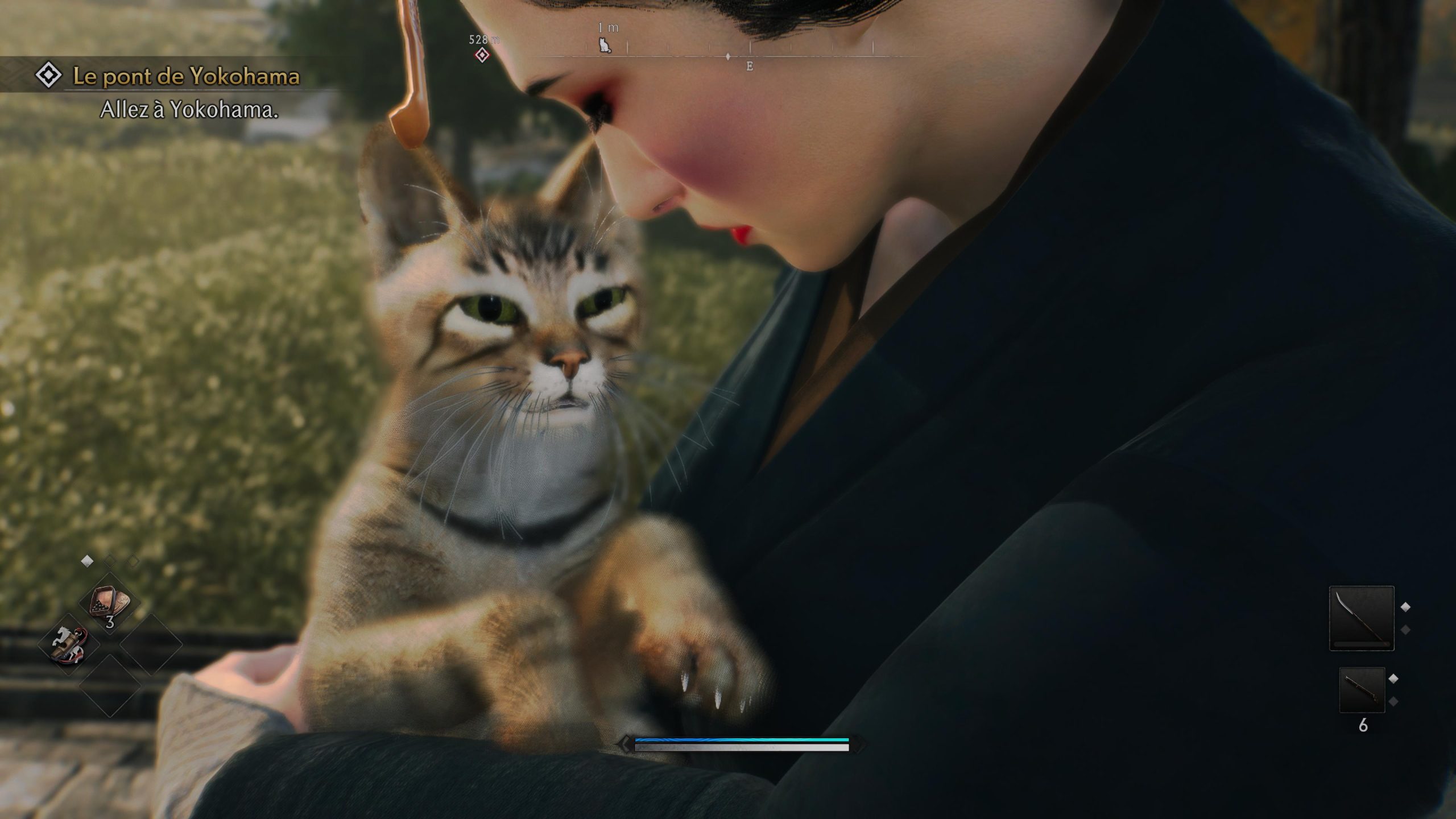 De manière générale, un lien plus fort impliquera davantage de récompenses, et ce dernier se muscle en réalisant diverses actions comme retrouver des chats perdus (oui, on peut les caresser, arrêtons d’en faire toute une histoire sur les réseaux sociaux ou achetez-vous une peluche), libérer des villages sous le joug de brigands, éliminer des samouraïs errants, trouver des caches et coffres ou encore allumer les bannières des lames. Ces équivalents des feux – ou bonfires – dans Dark Souls font office de checkpoint et permettent notamment de convertir le karma en points de compétences.