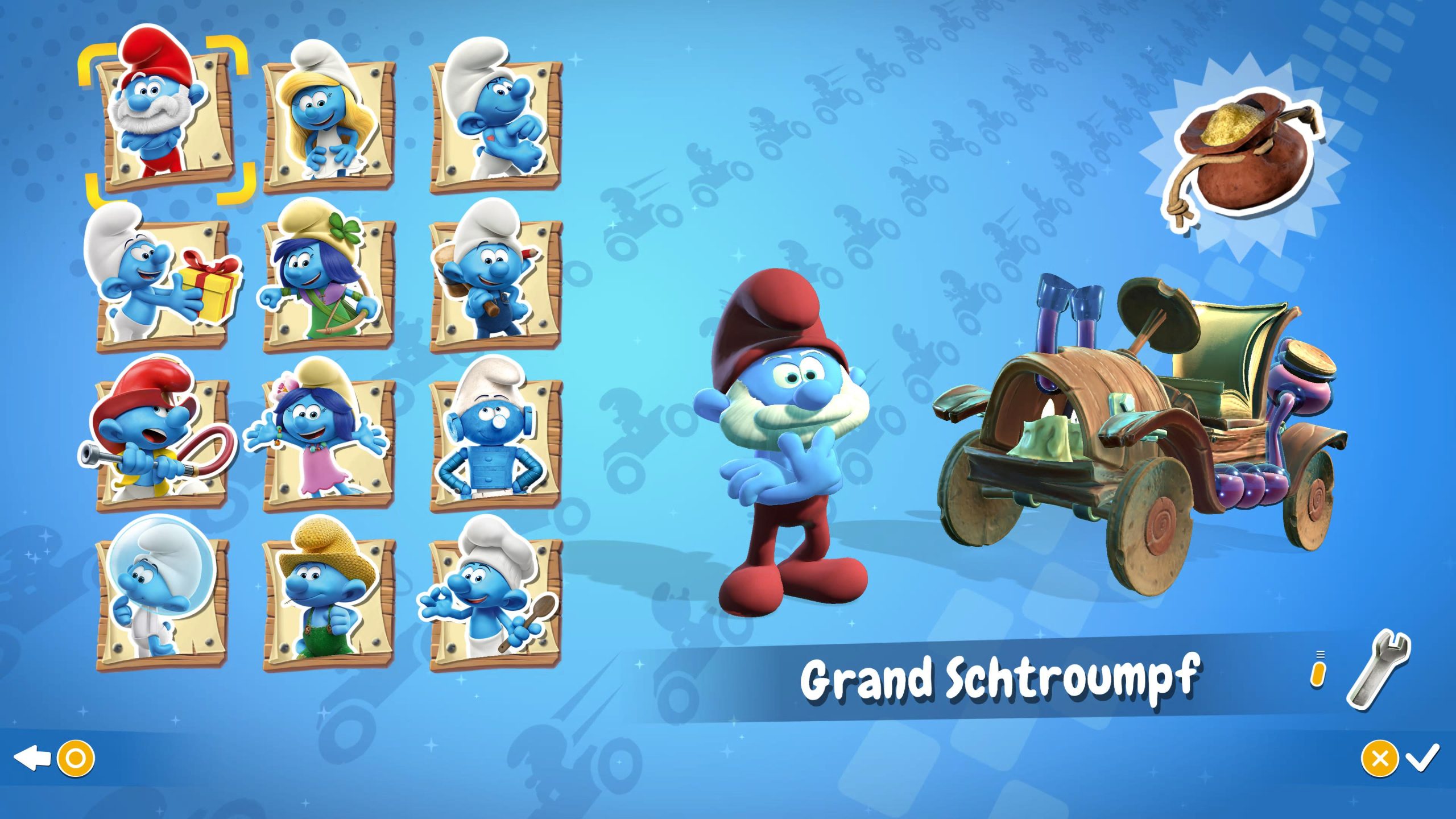 Dès le menu de sélection des personnages, on nous propose des paramètres pour avancer tout seul ainsi qu’une aide à la conduite pour ne pas tomber (avec pour le coup des icônes très proches de ce que propose Nintendo). Une fois la course lancée, tous les objets que nous avons pu rencontrer sur nos parcours n’ont aucune once d’originalité : un gland pour une carapace verte, une abeille lancée pour une carapace rouge, une feuille pour un champignon… autant dire que si vous recherchez de la nouveauté, ce n’est pas Schtroumpfs Kart qui vous comblera de plaisir. Même remarque pour les tremplins, il suffira d’appuyer sur la touche Saut pour faire une figure en l’air et ainsi bénéficier d’un petit boost non négligeable. La seule lueur vient de la sélection des personnages. Si tous nos Schtroumpfs ont des karts similaires concernant leurs caractéristiques techniques, chaque petit personnage bleu se différencie par un objet unique qu’il peut récolter en cours de course. Seul petit hic, ces objets uniques peuvent ressembler à des items disponibles pour tous les autres personnages : l’idée était donc pertinente, mais aurait mérité un tantinet d’être creusée davantage. Pour prendre un bon départ, Eden Games a choisi la simplicité. Il suffira de marteler le bouton X (ou A sur Nintendo Switch) jusqu’à mettre la flèche dans la zone verte au moment du départ : simple, mais efficace.