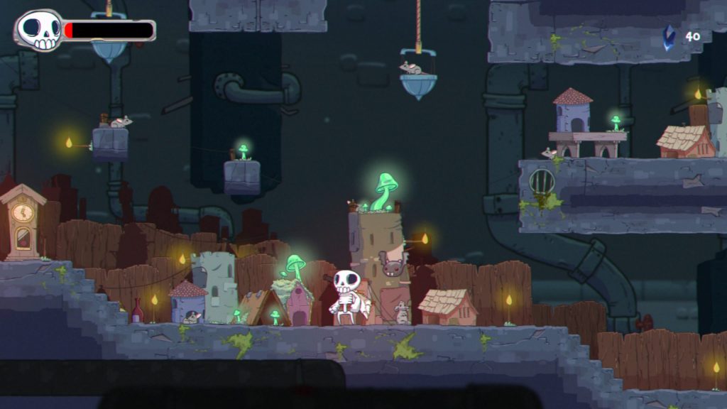 Ce que l’on retiendra surtout de Skelattack, et ce qui fait très certainement sa marque de fabrique, c’est la direction artistique. Les visuels étant des sprites dessinés à la main, avec des couleurs chatoyantes sans pour autant être trop saturées, on a eu beaucoup de plaisir à découvrir les niveaux, les personnages et les différentes ambiances qui se dégagent des espaces visités. On a ainsi accès à un panel de personnages tiers assez intéressants, à l’image du Roi des Rats qui fait invariablement penser à Ratigan dans le dessin animé Basil Detective Privé par exemple. À l’inverse, le bestiaire ennemi nous a semblé bien travaillé mais assez redondant malheureusement. Autant dire Skelattack saura attirer grâce à ses visuels tout bonnement funs et mignons. Il se prête ainsi très bien à tous les âges. Et si nous ne pouvons décemment pas terminer un test sans parler de la bande sonore, là non plus le soft ne brille pas de mille feux même si l’ensemble est sympathique en somme. C’est bien dommage car les premiers sons entendus étaient forts agréables, mélodieux et rythmés juste comme il fallait. Malgré tout, ça tend à se répéter et on finit par ne plus y faire tant attention que cela.
