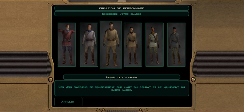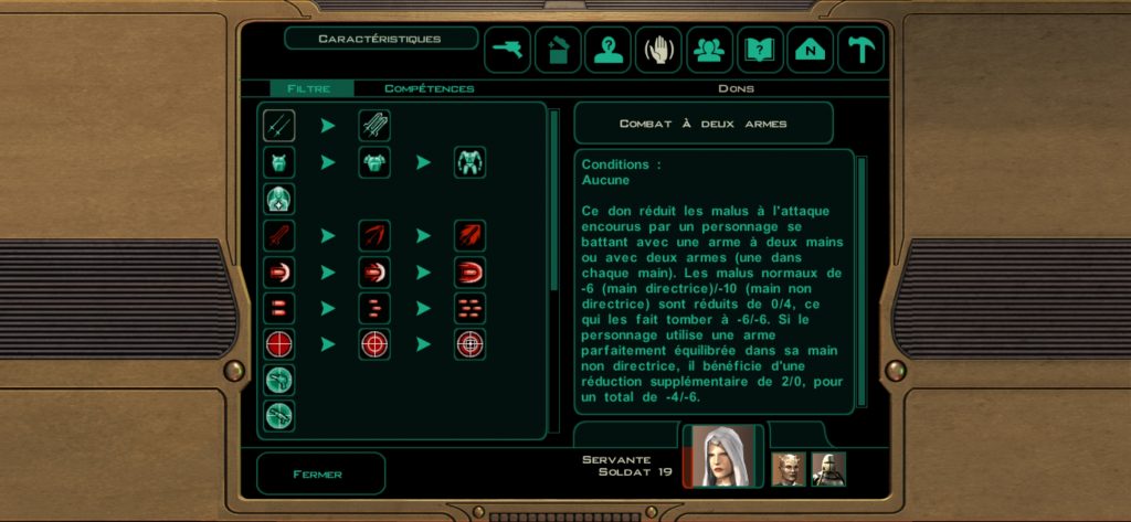 KOTOR II conserve les grandes lignes de son prédécesseur. Dirigiste le temps d’un prologue, puis la galaxie est à vous avec la possibilité d’accéder à plusieurs planètes, chacune recélant de secrets, de conflits à résoudre et de nouveaux compagnons potentiels. On retrouve toujours ce système de combat en temps réel avec la possibilité de passer en pause active afin d’affiner sa stratégie. Jusqu’à deux comparses pourront se joindre à vous – sauf dans quelques passages particuliers -, comme dans tout bon RPG, chacun excellant dans un domaine particulier et ayant ses armes de prédilection. Néanmoins, Obsidian Entertainment a voulu rendre les personnages un tantinet plus polyvalent que par le passé. Là ou Star Wars : Knights of the Old Republic ne vous autorisait qu’à vous équiper d’un seul et unique build d’armes, Obsidian Entertainement vous autorise à en définir un second. Cela peut s’avérer très utile dans certaines conditions, surtout pour les utilisateurs d’armes à distances pour qui l’ennemi viendrait les chercher au corps à corps. Il vous sera donc possible d’équiper une arme de mêlée dans ce second build que vos personnages pourront utiliser temporairement dans ce genre de situation. Autre nouveauté pour les utilisateurs de la force qui s’équiperaient d’armes de mêlée, l’apparition des postures de combat issues des arts Jedi. Chaque posture a son avantage et désavantage et devront être utilisées à bon escient en fonction du contexte des combats. On notera également une amélioration dans le choix d’attribution de rôles de vos personnages lors des rencontres. Jadis accessible via les menus dans l’onglet « script », elles apparaîtront désormais directement dans le HUD de combat. Au nombre de 3 auparavant, vous aurez maintenant accès à 5 rôles attribuables à vos personnages, ce qui affectera leurs actions en combat. La création de pièces d’équipement et de consommables font également leur apparition. Autrefois utilisés pour upgrader armes et armures, les établis serviront aussi à démanteler des pièces et en créer de nouvelles. Les laboratoires auront la même fonction pour ce qui concerne les consommables (packs de soins et de réparations, injections, etc…).