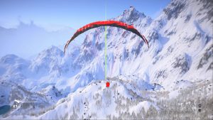 Des quatre sports, le parapente est peut-être le moins extrême mais les développeurs ont eu la bonne idée de l’intégrer en tant que moyen de se déplacer sur de longues distances tout en profitant du paysage. C’est également le seul qui permet de remonter la pente grâce à un système de courants d’air ascendants plus ou moins importants lorsque vous vous rapprocher des flans de montagne. Plus la paroi sera abrupte et plus le flux d’air sera important. Pas moins de 111 challenges sont disséminés sur la totalité de la map et ses différentes régions. Ils se débloquent au fur et à mesure que vous découvrez les Drop Zone et peuvent être lancés dans l’ordre que vous le souhaitez. Si les challenges de wingsuit et parapentes vous imposent le support de descente, vous aurez le choix des skis ou du snowboard pour tous les autres. Afin de casser la répétitivité du jeu, ces défis prennent de nombreuses formes différentes. De simples courses avec checkpoints, des sessions où il faut prendre le plus de risque possible, des concours de figures acrobatiques ou encore des courses d’orientation où seule l’arrivée est indiquée en contrebas. Comme très souvent dans ce genre de jeu, un système de médailles (or, argent et bronze) et des points d’expérience récompensent vos performances. Il y en a vraiment pour tous les goûts et toutes les difficultés. Mention spéciale à certains challenges de wingsuit très difficiles sur lesquels nous nous sommes arraché les cheveux une bonne centaine de fois avant de réussir.