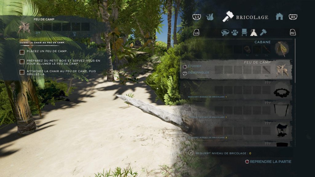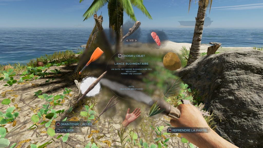 Notons également la gestion de l’inventaire qui n’est vraiment pas plaisante et très restreinte manette en mains. En effet, l’inventaire étant assez petit, on se retrouve très vite à devoir déposer des éléments ici et là près de notre campement, ou dans notre radeau, pour en ramasser d’autres. Autant dire que ça devient très vite agaçant quand vous êtes en train de crafter quelque chose mais qu’un message, en bas à droite de votre écran, vous indique que votre inventaire est plein. Il faut donc anticiper ses moindres faits et gestes et ce sans relâche. Comme si ce n’était pas déjà assez compliqué de survivre… Par ailleurs, il nous est arrivé plusieurs fois de voir un élément en remplacer un autre dans notre inventaire, sans nous en rendre forcément compte, nous faisant perdre l’objet dans la nature. Assez agaçant quand il s’agit de votre seul et unique outil nécessitant de répéter encore des actions de craft et de collecte pour le fabriquer à nouveau, alors que vous l’avez fait il n’y a même pas de cela deux minutes.