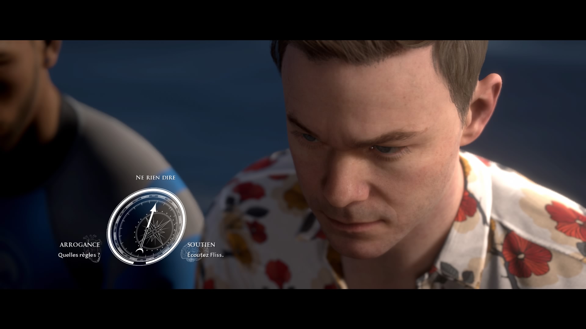En dehors des QTE pour les actions, les choix de dialogue se font via une roue s’affichant en bas à droite de l’écran. Elle comporte toujours 3 décisions différentes, catégorisées par un trait de caractère, et l’option « Ne rien dire ». Conrad, le frère de Julia, est issu d’une famille très aisée et est donc un jeune homme assez prétentieux, intrépide et arrogant. De ce fait, l’une des décisions narratives proposées suit sa personnalité. On peut avoir une impression de script assez restreint mais il n’en est rien en réalité, chaque personnage pouvant changer de comportement en fonction des choix du joueur.