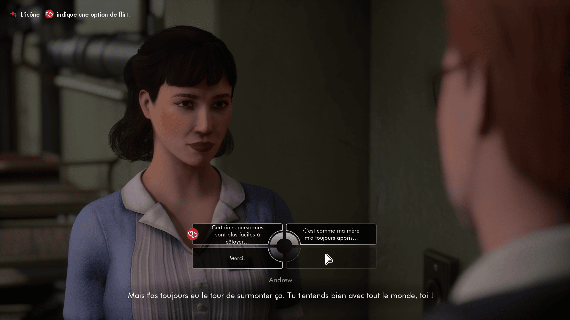 Toutefois, et malgré toutes ces critiques semblant un peu sévères, il y a de très bonnes choses à noter sur le premier titre du studio. L’histoire en elle-même est très prenante, et si vous êtes cinéphile ou même fan de romans, vous adorerez passer du temps à dénicher des clins d’œil ou directement des références à des romans d’enquête. De plus, l’époque choisie n’est pas très commune, surtout lorsque l’on nous met dans la peau d’une femme assez timide et réservée, à l’écart de la société, étant autant spectatrice que nous des années très patriarcales. Cette représentation est plutôt bien rendue, que ce soit par les réactions des autres PNJ ou encore par les nombreux dépliants glissés un peu partout dans l’hôtel. Pour renforcer cette immersion, le doublage québécois est de plutôt bonne qualité, tout comme le doublage en anglais. Bien que nous ayons rencontré quelques bugs liés au changement de langue en plein milieu de notre test, cela n’était pas trop dérangeant, car les personnages parlent lentement, ce qui nous permettait de rattraper le fil de la discussion sans trop être perdus.