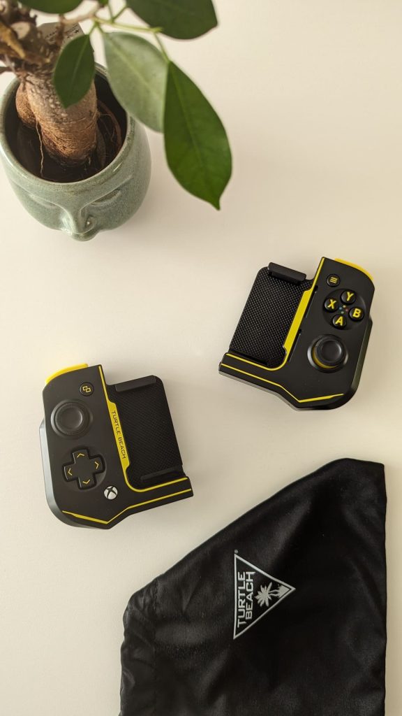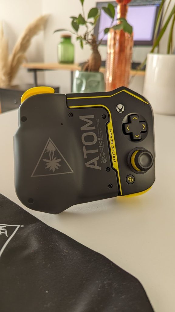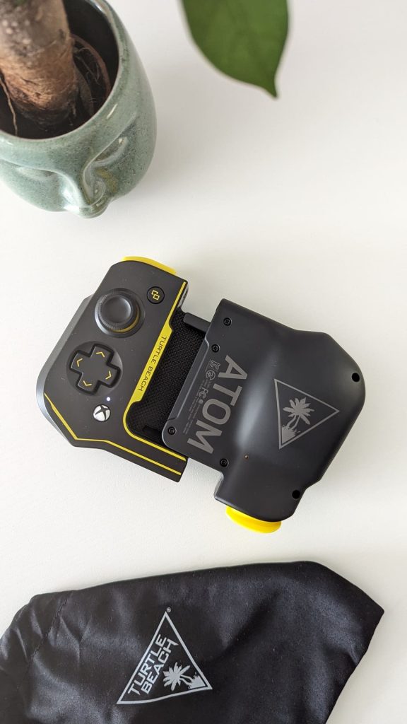La prise en main de l’Atom Controller est immédiatement familière. La forme rappelle sans mal celle d’une Nintendo Switch une fois le téléphone inséré. Elle offre ainsi un confort et une prise en main optimale grâce, notamment, au léger bombage de ses deux poignées ainsi qu’à la disposition de ses touches, facilement accessibles même pour de petites mains. La manette en elle-même est très légère (190g environ) mais le poids final de la manette est avant-tout affecté par celui du téléphone une fois ce dernier en place. Cela permet d’avoir une expérience équilibrée et non fatigante, même pour des sessions de jeu prolongées. La manette est étonnamment petite, ce qui conforte sur son aspect portatif et compacte. Les matériaux utilisés pour la manette sont essentiellement plastiques, mais ont un design mate. Ce qui lui offre sobriété et élégance. Le coloris de notre modèle est le noir/jaune, néanmoins il en existe d’autres : noir/cyan, noir/rouge et bleu cobalt. Ces design esthétiques ajoutent une touche de modernité à la manette et rappellent les design habituels des accessoires Turtle Beach sans pour autant oublier la compatibilité Xbox puisqu’un petit bouton Xbox est présent sur le modèle de notre manette et la disposition des touches est celle des manettes éponymes. Le bouton Xbox n’est d’ailleurs pas seulement là pour rappeler la compatibilité avec le Xbox Game Pass puisqu’il s’agit aussi du bouton marche/arrêt de la manette ainsi que du bouton de menu d’accueil Xbox une fois en jeu.