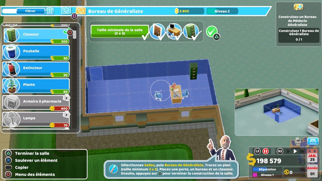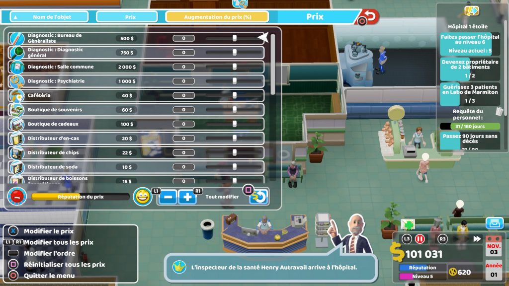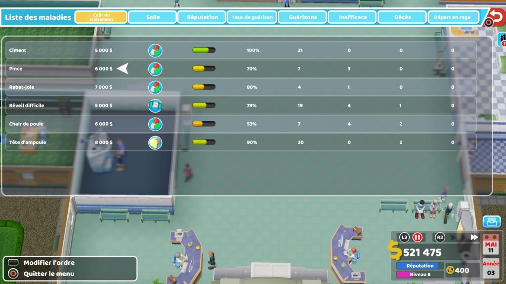 Pour cela, il faudra bien évidemment construire différentes salles proposant chacune un traitement particulier pour un type de maladie : certaines machines conviennent aux problèmes cardiaques, pour ne citer que cet exemple. Sans oublier qu’il faudra embaucher le personnel adéquat. En sachant que tous ne peuvent occuper le même poste : le médecin auscultera les patients dans un bureau généraliste tandis que l’assistant s’occupera de la réception de ces premiers. Les infirmiers, quant à eux, sont positionnés dans les salles communes. Et ça tend à se complexifier un petit peu. En effet, certains médecins ont des connaissances psychiatriques et seront donc en mesure de traiter ces malades contrairement à d’autres. En effet, chaque employé a le droit à ses propres spécificités, traits d’humeur et évaluations quant à son efficience. D’ailleurs, notons que nous avons droit à de plus en plus de types de salles, d’éléments et d’employés au fur et à mesure de notre progression à travers les missions.