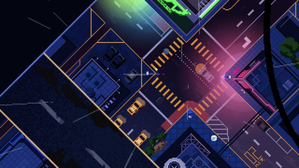 Se rapprochant encore une fois d’un aspect pixel art à la Thimbleweed Park, VirtuaVerse brille de génie visuellement. Tout est animé, depuis l’arrière-plan au premier plan, et profite d’une palette de couleurs vives représentant à merveille l’ambiance cyberpunk. Les différents quartiers proposent leur propre ambiance avec notamment des animations grâce aux panneaux publicitaires, aux passages de drones au-dessus de la tête de Nathan, aux personnages traversant de part et d’autre l’écran, à la présence de la pluie, etc. Les décors et animations ne lassent pas et nous poussent à vouloir en découvrir davantage au fil des heures. Ainsi, si vous êtes férus de Pixel Art, VirtuaVerse est totalement fait pour vous. Pour les autres, le soft est une bonne représentation de ce qui se fait actuellement en matière de Pixel Art.