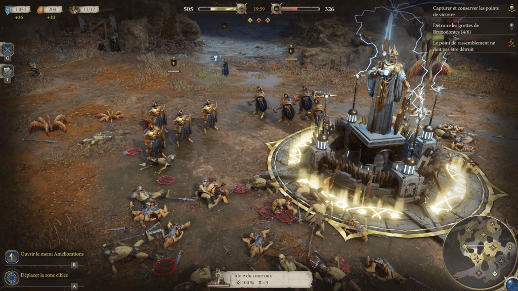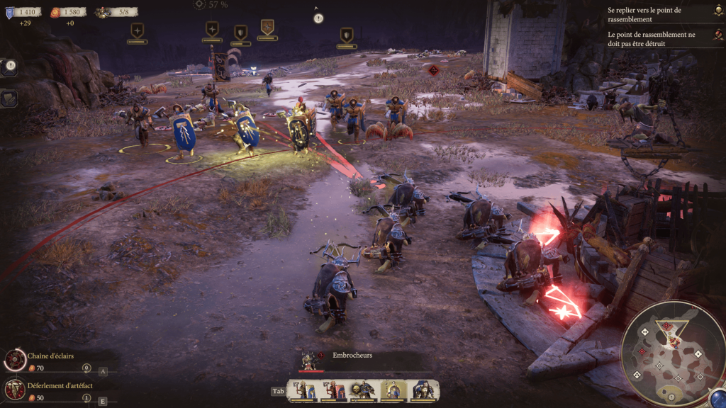 Car oui, après avoir compris les mécaniques de jeu, le système de zone à conquérir pour construire des bâtiments ainsi que des zones à défendre pour vous apporter la victoire, vous ferez face à un nouveau dilemme stratégique, la difficulté. Jamais nous nous sommes autant sentis frustré dans un jeu du même genre, tant la courbe de difficulté est aléatoire. Après trois premiers chapitres assez cohérents, le quatrième vous fera prendre possession de la dernière race jouable de RoR, les disciples de Tzeentch, roi démon, dans la mise en place d’une embuscade contre les Hantenuits. Malheureusement pour vous, vous comprendrez qu’en plus d’avoir des unités bien inférieures à l’adversaire, vous n’aurez pas assez de ressources pour combattre et en produire des nouvelles. Ce n’est qu’après 1h de jeu à recommencer le chapitre, que nous avons décidé de changer le niveau de difficulté et de terminer le chapitre en facile sur le bout du fil. Et cette difficulté aberrante se fera ressentir tout le reste de l’aventure, passant d’un chapitre extrêmement simple à un autre terriblement difficile sans aucune raison particulière. De plus, en prenant en compte la mécanique de jeu empêchant les unités de fuir un combat, l’ensemble de nos troupes tombaient comme des mouches face aux raz de marée adverse. Mitigé et rempli de frustration, nous nous dirigerons alors tout naturellement vers les autres mode de jeu entre escarmouche / conquête ou encore le mode multijoueur.
