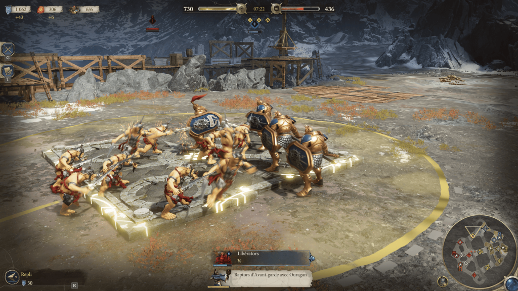 Le mode escarmouche est l’équivalent de partie rapide contre l’IA, de quoi s’entraîner sur les différentes maps proposées par le jeu avant de se lancer correctement dans des parties en ligne endiablées. Ici, seul 2 types de jeux vous seront proposés, entre des parties en 1v1 ou 2v2 assez triste, mais pas non plus de quoi enrager tant la disposition des maps sont faites de sorte à ne contenir seulement qu’un nombre limité d’unités. C’est sur ces mêmes cartes que l’on notera qu’il n’y a la possibilité de ne jouer qu’en un seul mode de jeu, celui du « roi de la colline » où il faut capturer des points et les défendre. Il aurait été sympathique de proposer des modes plus classiques comme celui d’exterminer entièrement son adversaire ou encore gagner via le nombre de ressources. Au-delà de ce point, le jeu reste le même et les mécaniques ne changeront pas, vous aurez la possibilité de jouer au choix l’une des 4 races proposées et d’y appliquer des palettes de couleurs différentes en fonction de celle proposée ou alors créée par vos soins.