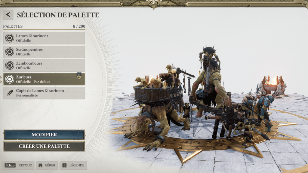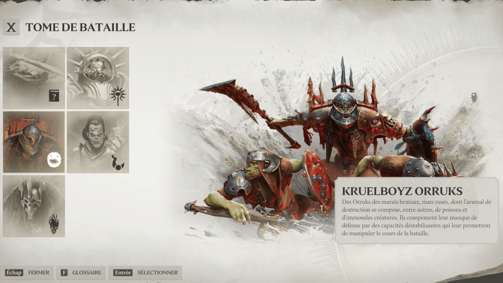 C’est en parcourant le tome de bataille, mis à disposition à tout moment, que l’on remarque un nouveau souci à l’horizon. Au-delà du fait que l’ensemble des fiches soient bien expliquées dans la partie « Comment jouer », nous offrant alors un peu plus d’explication sur les mécaniques du jeu ainsi que d’autre aperçu durant les premiers chapitres, le tout accompagné d’image illustrant parfaitement les situations nous permettant de bien comprendre ce que nous lisons. Le premier hic viendra lorsque vous regarderez du côté des races, et surtout du nombre d’unités qu’elles proposeront aux joueurs : 12 unités pour les Stormcast et les Hantenuits, 10 pour les Kruelboyz Orruks et 9 pour les Disciples de Tzeentch. Cela fait bien trop peu lorsqu’on le compare aux inspirations de Frontier, dans Dawn of War 2 par exemple : 6 races étaient jouables pour un total d’environ 12 unités en moyenne. À cela s’ajoute un nouveau point noir, et non des moindres pour les fans des RTS Warhammer, la customisation des unités. Bien que l’idée de proposer des couleurs similaires à ce que l’on peut retrouver dans des boutiques Warhammer, avec les noms exactes des pots de peinture, ou alors des palettes prédéfinies rappelant des clans importants de l’univers Warhammer, soit une très bonne idée sur le papier. La customisation des unités se limitera seulement aux couleurs et pas plus, n’offrant alors pas la possibilité d’ajouter des motifs ou alors des couleurs personnalisées via une roue chromatique. Un choix étonnant qui, encore une fois, en comparaison avec les autres RTS de la licence, proposeront beaucoup plus et avec de meilleures options de détails. Vous ne passerez donc pas des heures à customiser vos petites figurines, tant le temps n’en vos pas la chandelle. Toutefois, on pourra noter la qualité des animations des différents personnages et différentes races, qui nous offre toutes des multitudes de détails fort sympathiques aux fans (mention spéciale pour les Orruks, aussi bien pour les animations que pour leurs doublages).