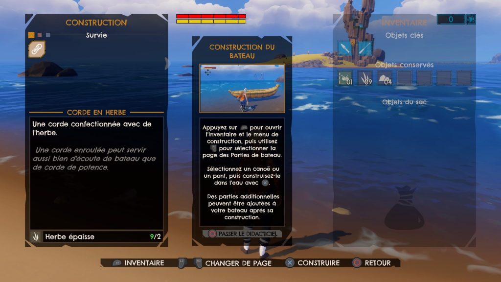 Cela peut sembler un peu rédhibitoire de voir seulement un titre à travers les yeux d’une comparaison avec un jeu pré-existant. Pourtant, Windbound emprunte beaucoup de mécaniques à plusieurs titres s’étant déjà illustrés et ayant rencontré un grand succès. Alors, oui, la réponse est assez rapide : le soft de 5 Lives Studio a une affiliation certaine avec The Legend of Zelda: Breath of the Wild mais ce n’est pas tout (on pourrait d’ailleurs en citer d’autres, tels que Rust, Raft, Stranded Deep, etc.). Ne serait ce que via ses mécaniques de survie somme toutes classiques, demandant de récolter telle et telle ressource afin de crafter un outil, une arme ou un autre élément, dans un monde aussi bien dangereux que charmant. On pourrait ajouter aussi le fait qu’une fois la barre de santé atteinte, ou bien l’endurance amoindrie, il faut absolument se nourrir pour retrouver une certaine énergie. Pour cela, il faudra donc cueillir des baies ou bien chasser des animaux, dont le bestiaire est assez varié sans pour autant faire de véritable miracle. D’ailleurs, tous les éléments craftés sont susceptibles de se briser, à l’image du bateau qui pourrait se délabrer à mesure des rencontres dangereuses ou éléments aquatiques que l’on percute (rochers etc).