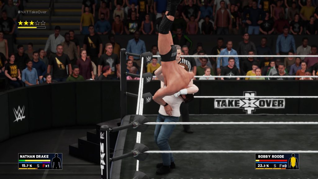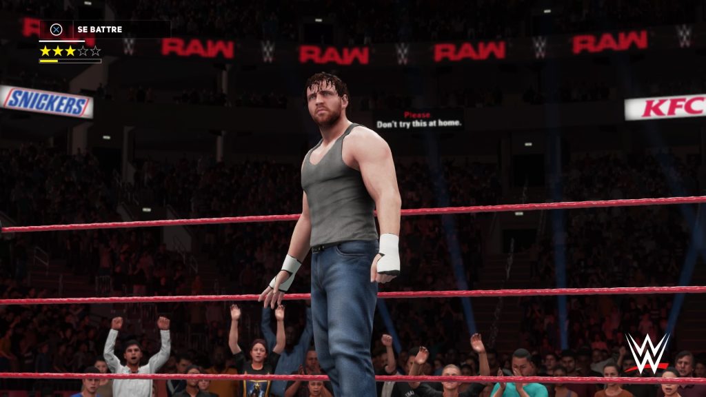 Yuke’s et 2K ont toujours voulu offrir une simulation de catch exigeante. Hélas, d’énormes défauts ont entaché les éditions précédentes et c’est avec un nouveau moteur graphique que les développeurs ont voulu remédier à ce mal. Clairement, nous sommes forcés de constater une réelle amélioration au niveau de la modélisation des combattants (comme du public) ou même pour ce qui est des effets de lumière. L’immersion dans les arènes est bien là et l’ambiance durant les matchs n’a rien à envier au show télévisé. Cependant, toutes les grosses tares n’ont pas été éradiquées pour autant et des bugs toujours trop nombreux répondent à l’appel. Il n’est pas rare qu’un adversaire se bloque dans un coin et ne parvienne pas à rejoindre le ring par ses propres moyens. Aussi, les superstars ont même tendance à se prendre dans les cordes autour du ring, ce qui donne lieu à d’étranges scènes comme un bras qui se tord complètement ou même un catcheur qui s’envole pour atterrir un peu plus loin. Si ces glitchs sont assez drôles dans un premier temps, ils deviennent tout aussi pénibles à la longue. Le pire, c’est qu’ils restent encore et toujours présents, et ce malgré les patchs… C’est une constante dans les jeux WWE, les bugs perdurent, mais heureusement cela n’arrive pas tout le temps. Pour en rester au niveau des imperfections, sachez que les commentateurs sont uniquement disponibles en anglais et que leurs commentaires sont absolument infectes. Parfois, il est même possible qu’une phrase soit répétée trois, quatre, ou cinq fois de suite. Il faut clairement plus de travail dans ce domaine tout comme dans la bande-son qui nous accompagne dans les menus. Supervisée par Dwayne « The Rock » Johnson lui-même, cette playlist ne compte que 11 morceaux à la qualité très inégale. Après, c’est évidemment une question de goût mais nous pouvions au moins espérer y trouver plus de variété. Ne vous inquiétez pas pour autant, tout n’est pas à jeter dans ce WWE 2K18, loin de là!