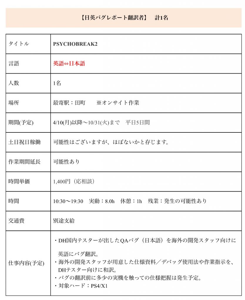 Il semblerait donc que le succès de The Evil Within ait motivé Tango Gameworks et Bethesda a se lancer dans la production d’un nouvel opus, puisque l’on a découvert aujourd’hui une offre d’emploi pour un certain Psycho Break 2. Pour rappel, Psycho Break n’est ni plus, ni moins que le nom nippon de The Evil Within. Ainsi, l’offre d’emploi, publiée en japonais et que vous pouvez retrouver ci-dessous, concerne le poste de traducteur et de bug reporting. Etant donné que le prochain titre à venir de Tango Gameworks est en développement depuis 2 ans, il est fort probable que l’on en entende parler cette année et qu’il s’agisse de ce fait, de The Evil Within 2