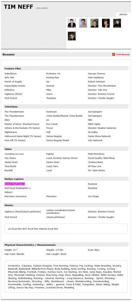 En effet, un acteur du nom de Tim Neff, qui a tourné sur plusieurs films, séries télé et jeux vidéo, a mentionné un certain GTA 6 sur son CV. Cela laisserait entendre que la motion-capture du sixième opus a débuté et pourrait même être bien avancée.