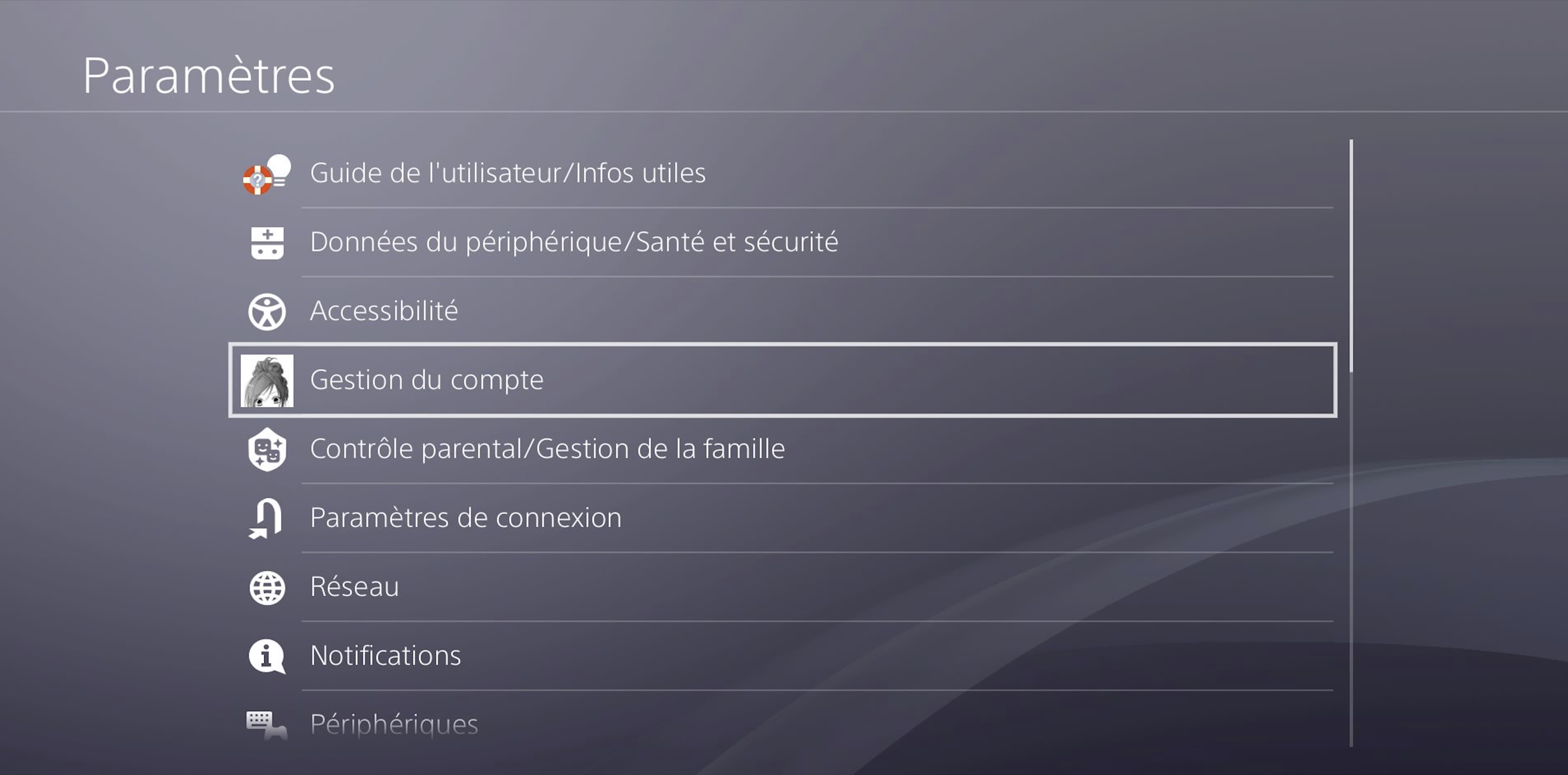 Pas de panique, il existe une solution qui semble fonctionner dans la majorité des cas. Il suffit de vous rendre dans les [Paramètres] de votre console, puis [Gestion du Compte]. Assurez-vous avant tout d’être connecté à votre compte PlayStation Network, évidemment.
