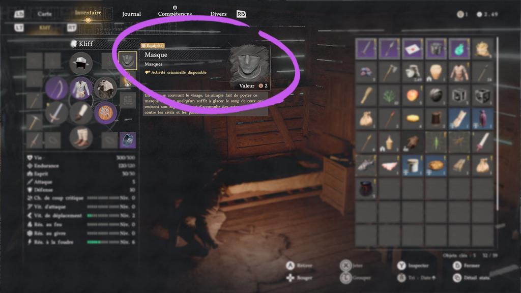 Dans Crimson Desert, voler n’est pas une action accessible par défaut. En effet, pour pouvoir dérober des objets, vous devez impérativement vous équiper d’un masque. Ce masque permet de dissimuler partiellement votre identité et sans lui, il est tout simplement impossible de voler des objets, l’option de vol restera grisée tant qu’un masque ne sera pas équipé.