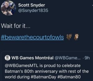 Pour ce qui est des rumeurs et des indices à notre disposition, ce nouveau Batman à la sauce WB Games Montréal, qui a travaillé sur Batman: Arkham Origins, mettrait en avant une version remaniée de l’arc La Cour des Hiboux. On en parlait déjà l’année dernière et Scott Snyder, auteur de comics qui a travaillé sur La Cour des Hiboux, a plus ou moins confirmé la chose via un message sur Twitter (supprimé depuis mais Internet n’oublie jamais) :