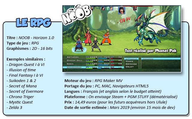 Dans la forme, ce jeu NOOB sera un RPG en 2D dont l’esthétique et le gameplay s’inspireront fortement de titres bien connus comme The Legend of Zelda: A Link To The Past, Secret of Mana ou encore Final Fantasy I à VI. Vous pouvez retrouver toutes les explications dans la vidéo en haut de cet article.