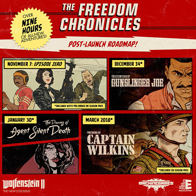 - Episode Zéro (disponible pour toute précommande et déjà disponible) – Joseph Stallion, Jessica Valiant et Gerald Wilkins combattent pour la paix en Amérique. Frayez-vous un chemin à travers les hordes nazis en utilisant vos capacités uniques ainsi qu’un arsenal d’armes à feu dans une nouvelle mission inédite.